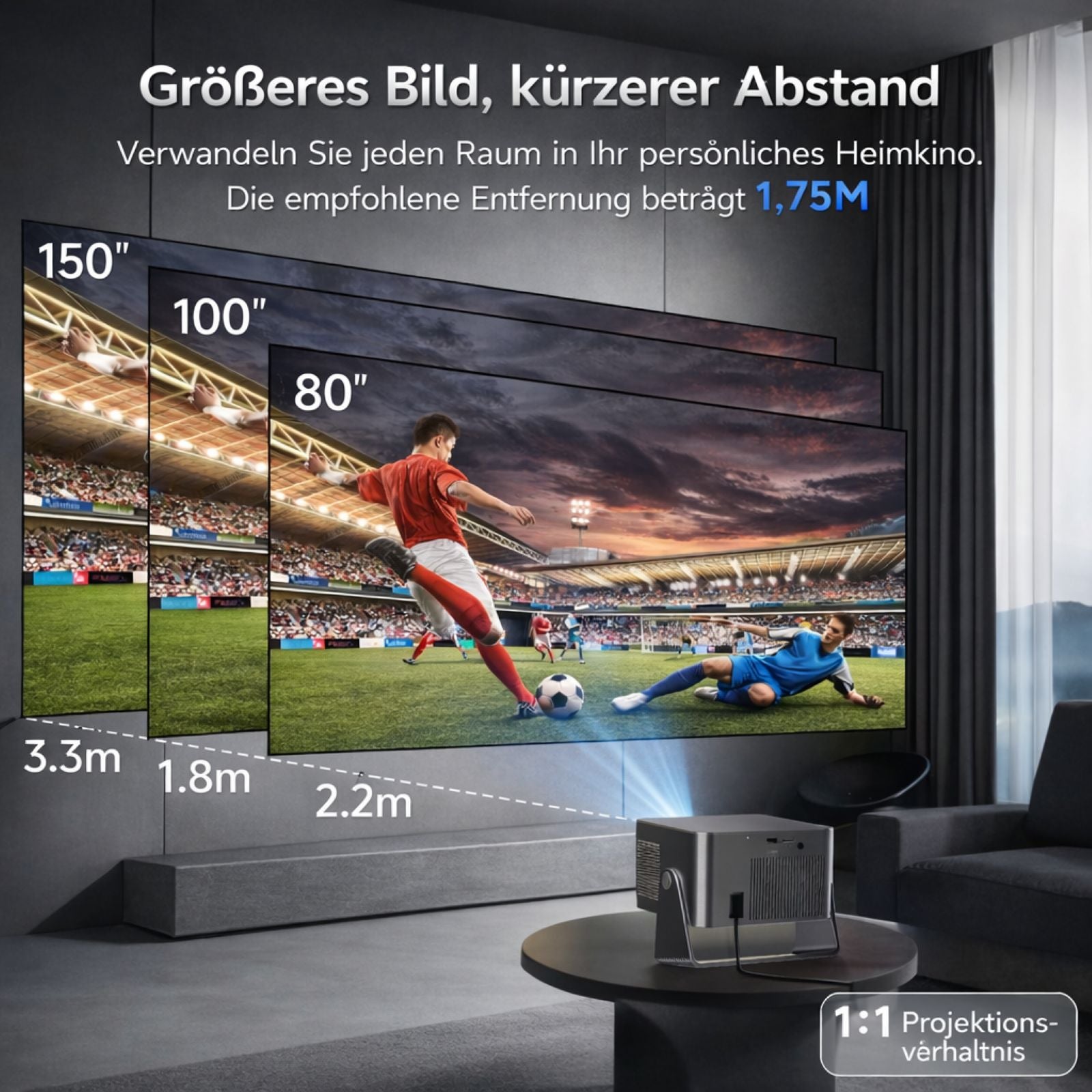 ✓ 1:1 Projektionsverhältnis – klassisches Wohnzimmer-Setup